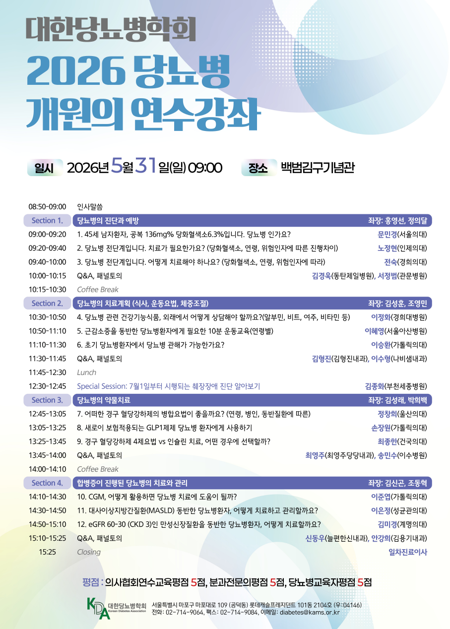 2026 당뇨병 개원의 연수강좌 사전등록 안내(5/31(일), 백범김구기념관)