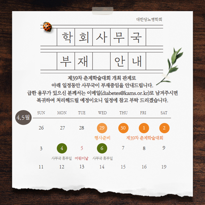 대한당뇨병학회가 운영,관리하는 웹페이지상에서, 이메일 주소 수집 프로그램이나 그 밖의 기술적 장치 등을 이용하여 이메일 주소를 무단으로 수집하는 행위를 거부합니다.