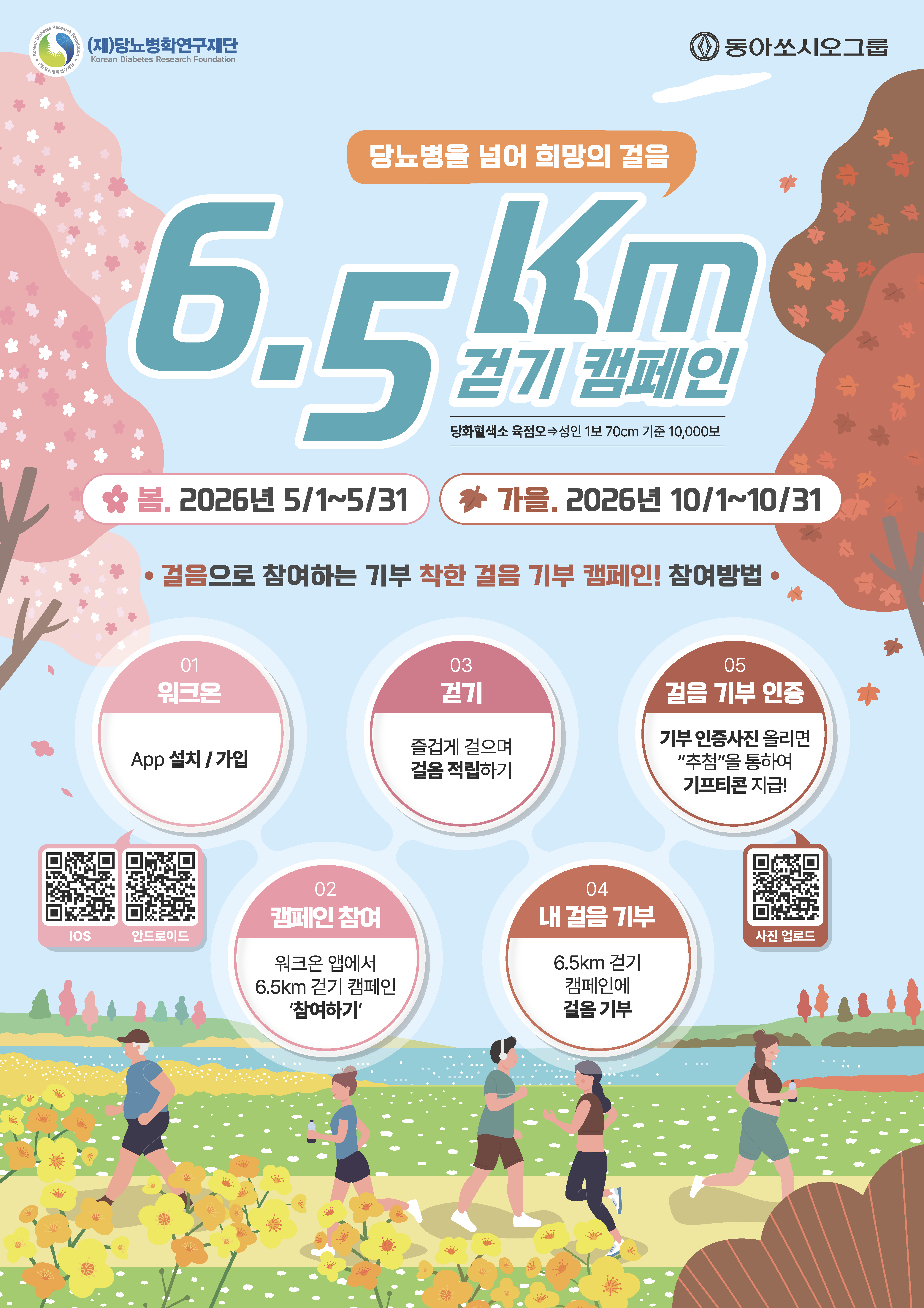 올 봄에도 당뇨병학회 회원 및 당뇨병 환자, 가족, 일반인과 함께하는 "6.5km 걷기 캠페인"이 이어집니다.