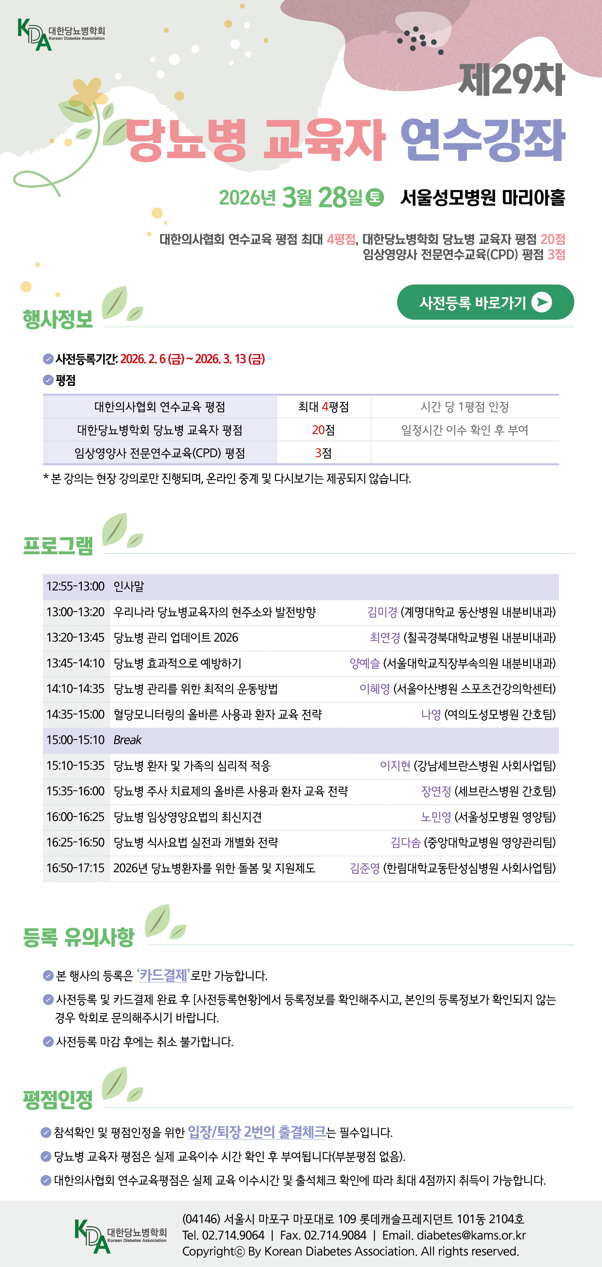 대한당뇨병학회가 운영,관리하는 웹페이지상에서, 이메일 주소 수집 프로그램이나 그 밖의 기술적 장치 등을 이용하여 이메일 주소를 무단으로 수집하는 행위를 거부합니다.