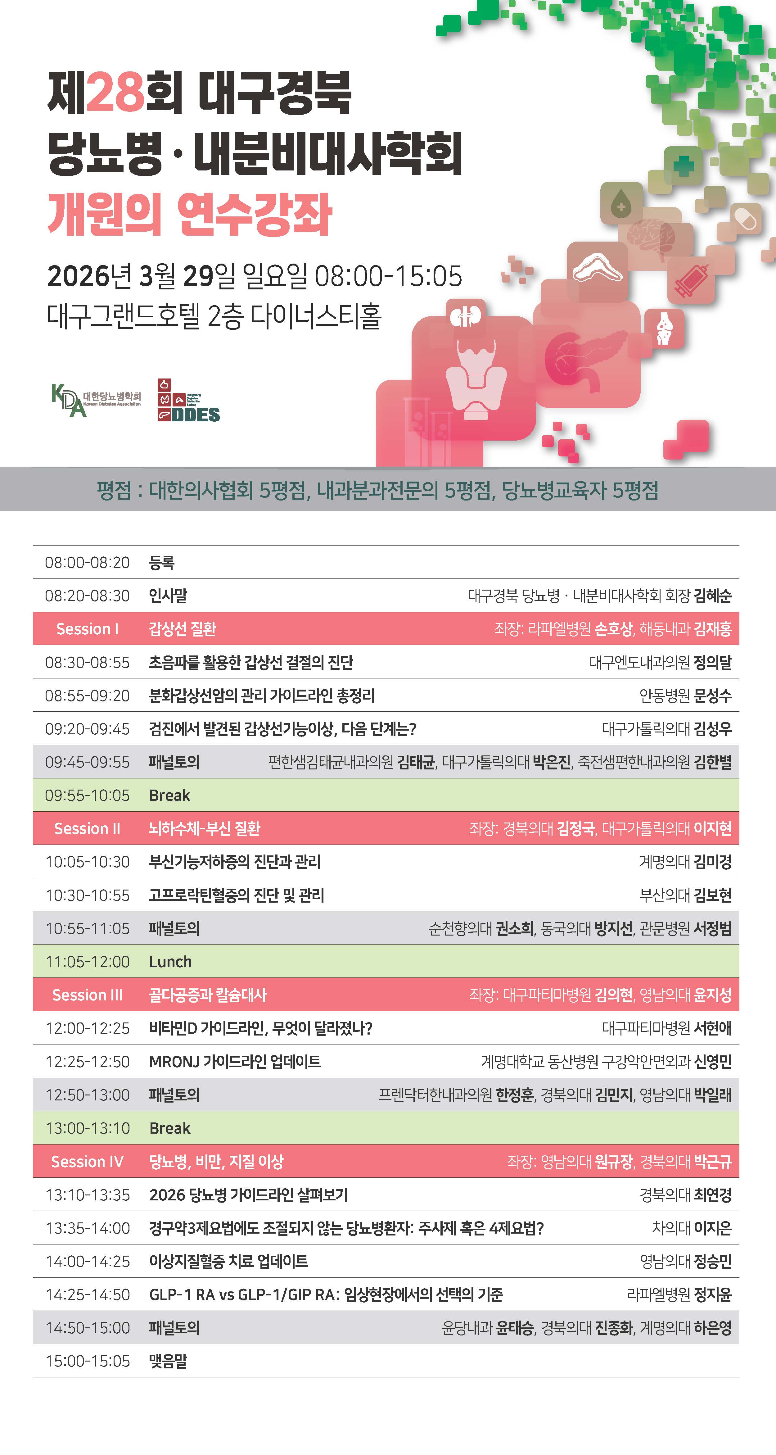 제28회 대구경북 당뇨병내분비대사학회 개원의 연수강좌 관련 문의 사항은 아래 참고하시어 연락 부탁드립니다.